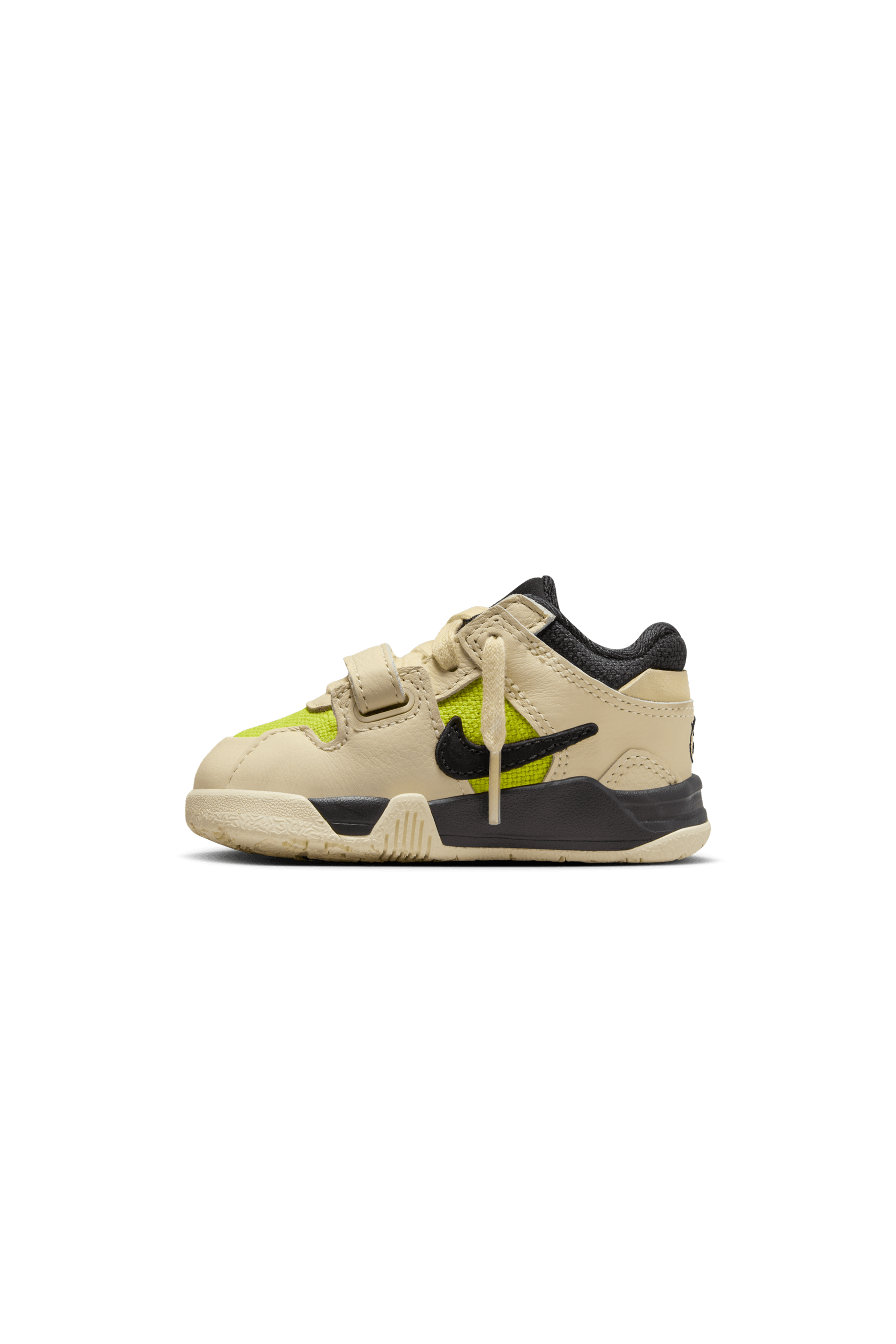 The shoe features a vibrant Bright Cactus canvas upper, beautifully contrasted by Muslin tumbled leather overlays and a sturdy midfoot strap. These materials not only add to the shoe’s visual appeal but also enhance its durability and comfort. The design is further elevated with black detailing on the tongues, collars, inner lining, and iconic Swoosh logos, creating a striking contrast that highlights the shoe’s vibrant colorway. One of the most notable features of the Jumpman Jack TR "Bright Cactus" is the inclusion of the Cactus Jack face logo on the back heel. The cream-colored rubber outsole provides a solid foundation for the shoe, with "Jack" inscribed in oversized black lettering, adding a bold statement to the design.